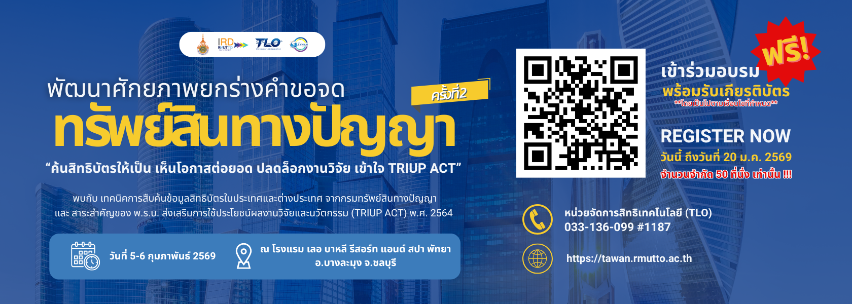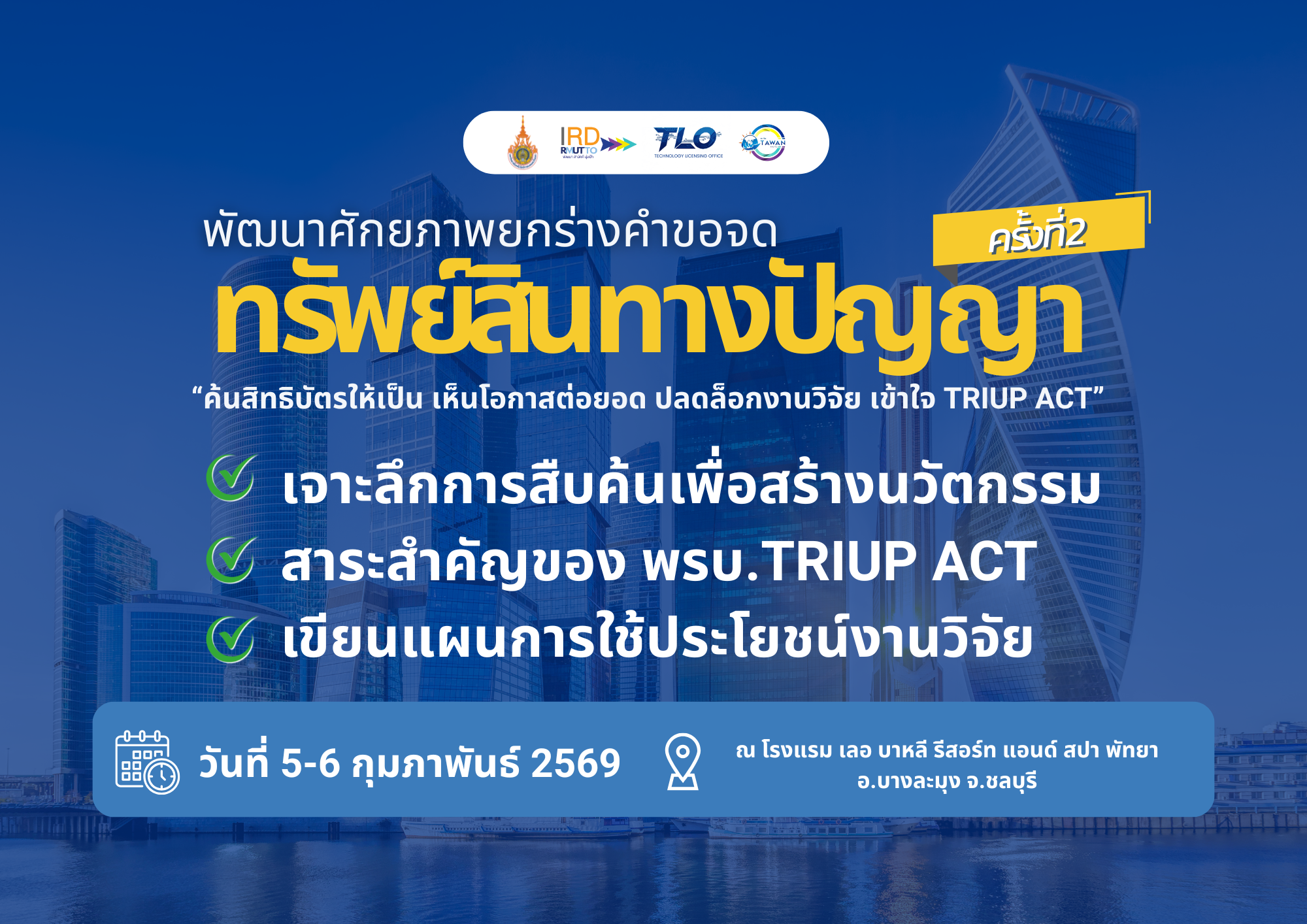 ขอเชิญนักวิจัย เข้าร่วมกิจกรรมพัฒนาศักยภาพการยกร่างคำขอจดทรัพย์สินทางปัญญา ครั้งที่ 2