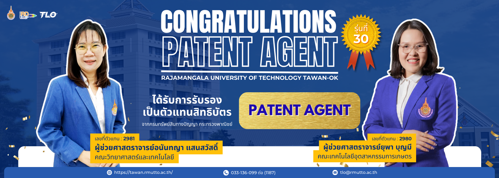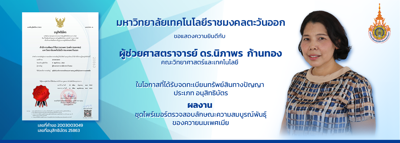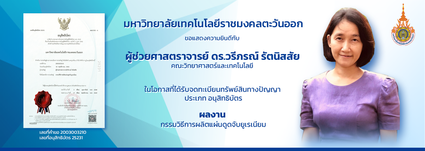 สถาบันวิจัยและพัฒนา มหาวิทยาลัยเทคโนโลยีราชมงคลตะวันออก ขอแสดงความยินดีกับ "ตัวแทนสิทธิบัตร (Patent Agent)"