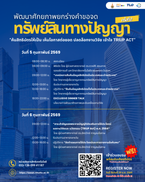 ในการนี้ สถาบันวิจัยและพัฒนา จึงขอเรียนเชิญนักวิจัยที่มีรายชื่อ เข้าร่วมกิจกรรม "การพัฒนาศักยภาพการยกร่างคำขอจดทรัพย์สินทางปัญญา ครั้งที่ ๒" ระหว่างวันที่ ๕ - ๖ กุมภาพันธ์ ๒๕๖๙ ณ โรงแรมเลอ บาหลี รีสอร์ท แอนด์ สปา พัทยา จังหวัดชลบุรี โดยสามารถสแกน QR Code หรือ คลิกลงทะเบียนที่นี่ เพื่อตอบรับเข้าร่วมกิจกรรม ภายในวันอังคารที่ ๒๐ มกราคม ๒๕๖๙